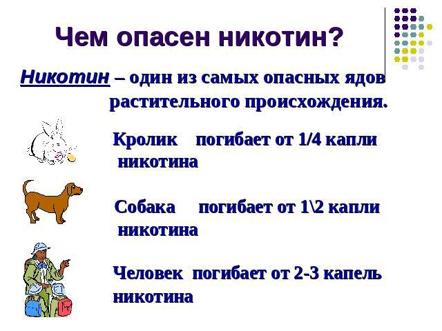 Люди сумели создать яд, медленно убивающий организм, а теперь ищут противоядие. Алкалоид, обнаруженный в табаке, также содержится в других растениях, но в значительно меньших количествах.