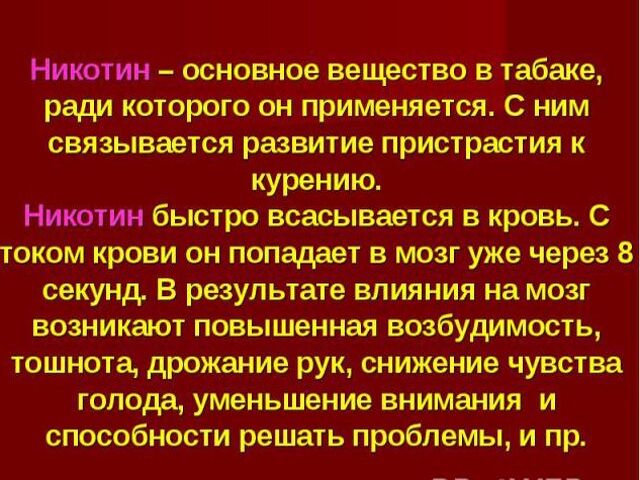 Курение оказывает возбуждающее действие на организм, человек стремится продлить это ощущение. При этом наступает никотиновая зависимость, от которой сложно избавиться. У человека постоянно возникает острая необходимость закурить, а если это сделать невозможно, то нарушается поведение и состояние здоровья.