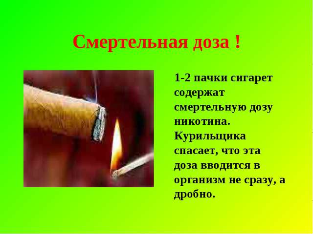 В одной сигарете находится 1,2 миллиграмма маслянистой жидкости. Если ее ввести через вену, то это приведет к летальному исходу. Данной дозы хватит, чтобы убить семь взрослых человек.
