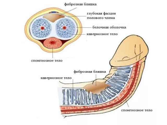 - Например, при болезни Пейрони прогрессирует фиброзный компонент в белковой оболочке полового члена. Плотные бляшки искривляют пенис, а половой акт сопровождается выраженным болевым синдромом.