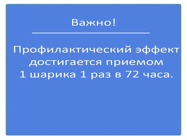 Профилактический эффект достигается приемом 1 шарика 1 раз/ 72 часа.