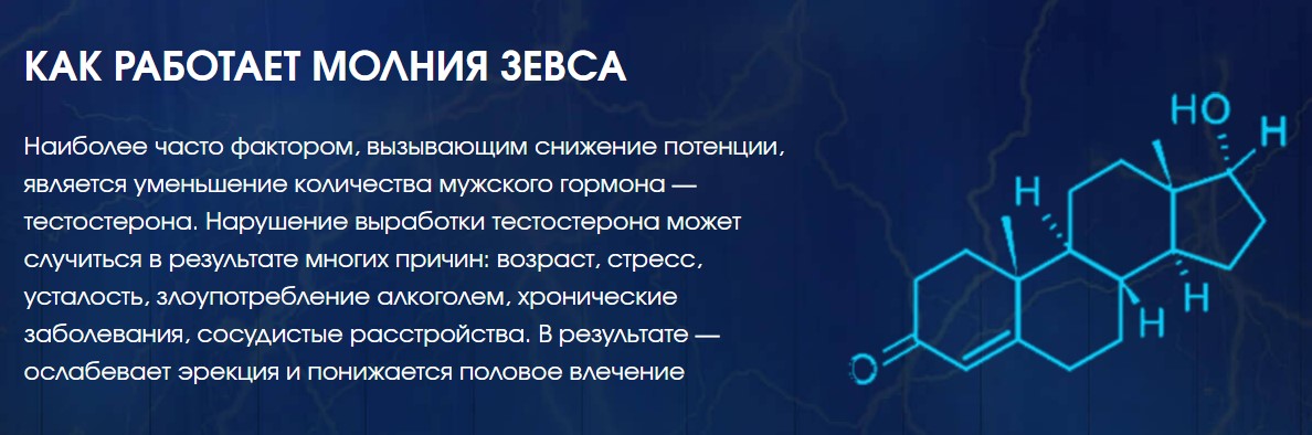 Благодаря богатому составу, Молния Зевса мягко действует на функционирование половой системы мужчины, увеличивает его либидо и налаживает эрекцию. Лечущее средство можно употреблять для профилактики либо в тех вариантах, когда сексапильные расстройства появились по психическим причинам.