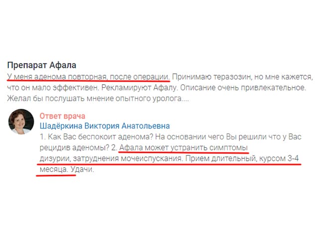 Но, если обратиться к форуму 03 URO , где пациенты могут задавать вопросцы докторам и получать онлайн консультации, то можно увидеть обратный эффект. Докторы назначают пилюли Афала для снятия симптоматики простатита.